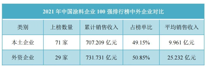 榜单显示,在前10强企业中,外资企业占据了6席,本土企业占据了4席,上榜数量较往年未发生变化。此外,中外企业间的收入差距仍存在但却在快速缩小,本土企业排名第一的三棵树2020年涂料业务销售收入为72.695亿元,与外资企业排名第一的立邦销售收入虽然相差101.395亿元,但差距已大幅缩小。