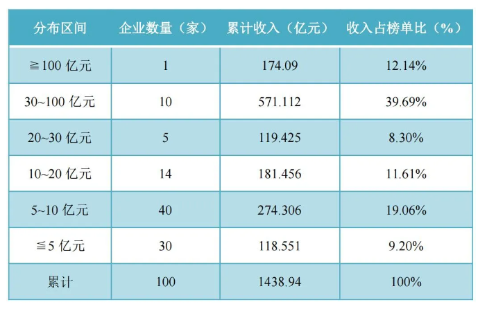 从企业规模分布来看,今年上榜企业在规模和数量上依然分布不平衡,企业间差距较大。销售收入超过100亿元的企业数量仅1家,较往年未变;在30-100亿元之间有10家,较往年新增1家;在20-30亿元之间的为5家,在10-20亿元之间的有14家,在5-10亿元之间的有40家,5亿元以下的为30家。(如下表)
